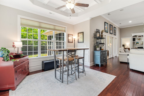 The dining area, currently shown as an office, is separated from the rest of the house by a knee wall, yet feels completely open for entertaining guests.
