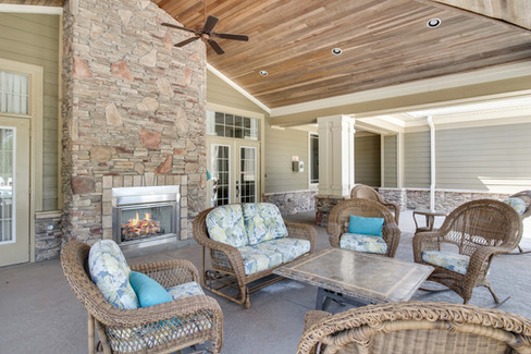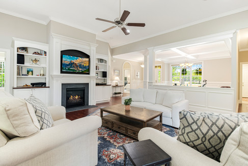 The great room features custom built-ins around the propane fireplace, surround sound speakers, and 12 foot high ceilings.
